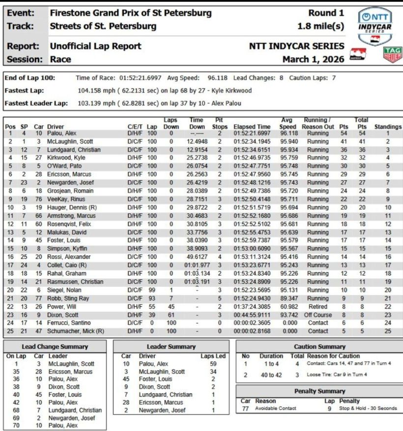 Palou repeated his victory in the Firestone Grand Prix of St. Petersburg virtually the same wat he did last year. Palou stayed out the longest before his first pit stop, which allowed him to build up a lead e only lost briefly after his second stop.