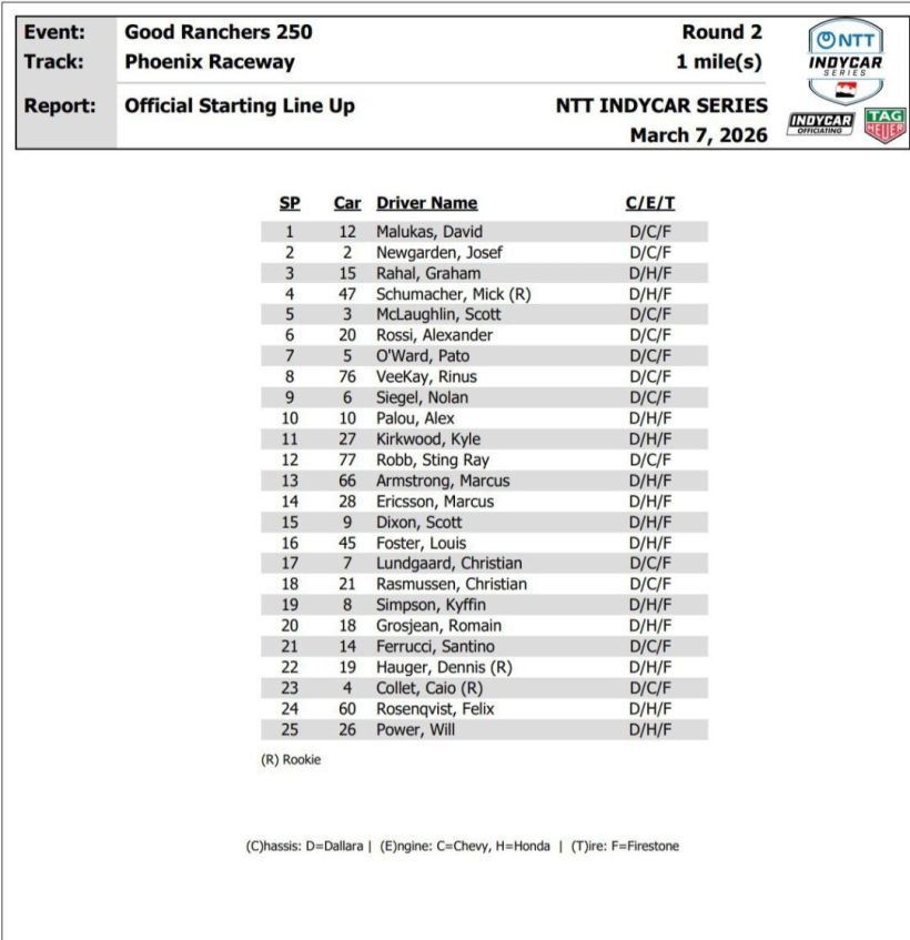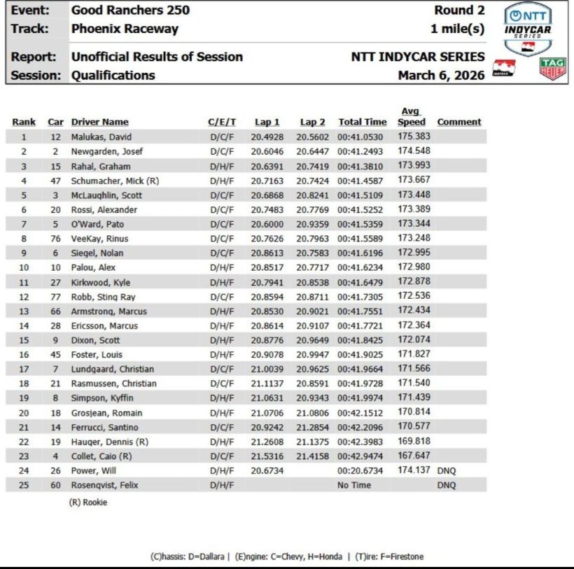 Graham Rahal had his best qualifying effort on an oval since IndyCar raced at Richmond. RLL locked out the second row with Rahal and Schumacher. RLL appears to be much improved on ovals in2026. I hope this carries over to the Indianapolis 500, where they have str4uggled lately.