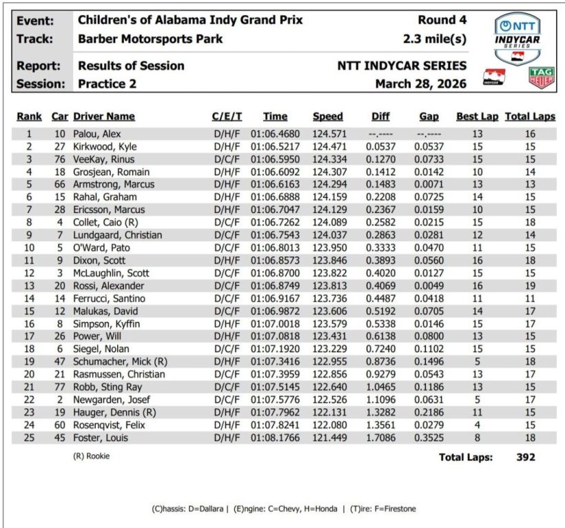 Twelve entered drivers have led laps: Will Power 216, Alex Palou 153, Josef Newgarden 141, Scott McLaughlin 85, Rinus VeeKay 58, Pato OâWard 52, Scott Dixon 46, Graham Rahal 25, Santino Ferrucci 14, Marcus Armstong 6, Alexander Rossi 3 and Felix Rosenqvist 1 .Three NTT INDYCAR SERIES Rookie of the Year contenders â Caio Collet, Dennis Hauger and Mick Schumacher â are entered and will race an NTT INDYCAR SERIES car at Barber Motorsports Park for the first time. Hauger won the INDY NXT by Firestone race at the track in 2025.