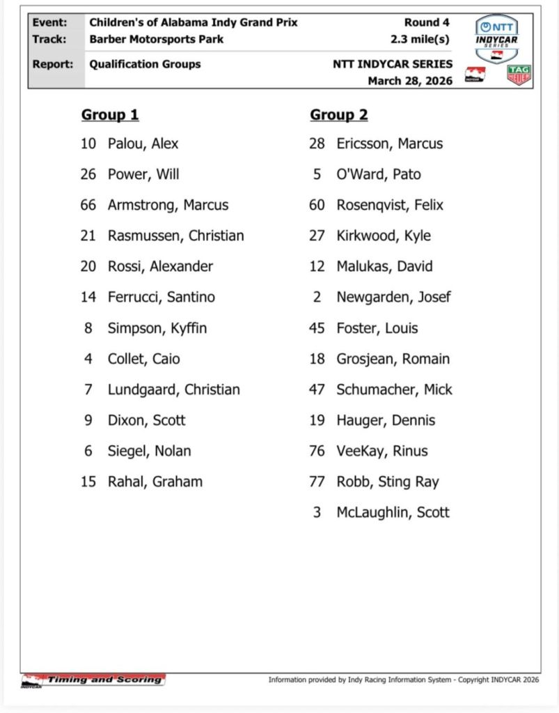 .INDY NXT by Firestone Notes:INDY NXT by Firestone resumes its 2026 season this weekend with a doubleheader at Barber Motorsports Park. Teenagers Nikita Johnson and Max Taylor have won the first two races of the year but will face an equally tough test with Barberâs twinbill. Taylor and his Andretti Global teammates should enter with confidence as they were among the fastest cars in an offseason series test at the track. A record 24-car field for the INDY NXT Grand Prix of Alabama doubleheader is expected at Barber Motorsports Park. There were a record 21 cars in 2021. While none of the current field of drivers has won an INDY NXT by Firestone race at Barber, Myles Rowe has visited victory lane at the picturesque road course, winning a USF 2000 Championship race in 2022.Group qualifying will decide the starting grid on road and street circuits but with a twist for the doubleheader. Based on the best lap times from the practice session immediately preceding qualifying, the fastest driver in that session will choose which group will compete in the first of the two qualifying sessions. With 10 minutes allotted for each group (with a guarantee of one timed lap), the fastest driver between the two sessions will be awarded Race 1 pole position with the drivers who finished behind that driver, in order and in that group, occupying the odd-numbered starting positions (3, 5, 7, etc.) for the race and the drivers who finished in order from the other group occupying the even-numbered starting positions (2, 4, 6, etc.). The second-best laps set by each driver in their group will apply to Race 2. One driver and entrant championship point will be awarded to the fastest car in each qualifying group. |