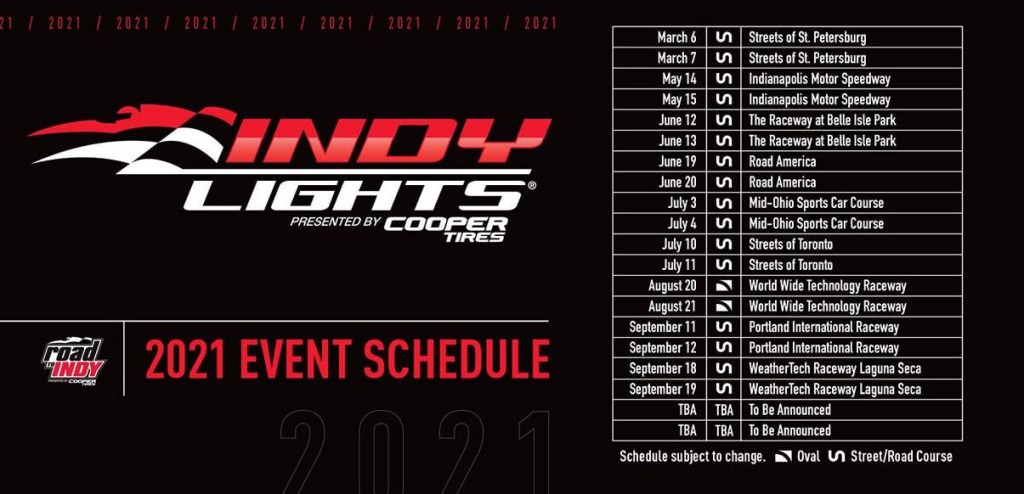 The two oval races will be at World Wide Technology Raceway August 20 and 21. The schedule also has Indy lights returning to the Detroit GP for the first time in a few years.