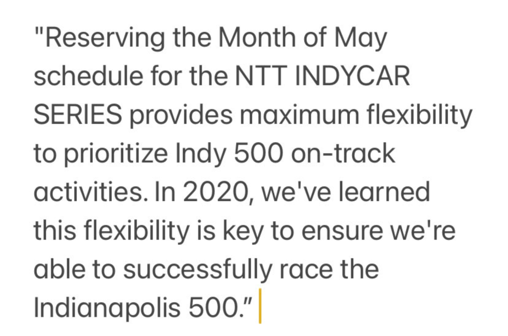 Update: Indycar has issued a statement regarding no Freedom 100 in May: