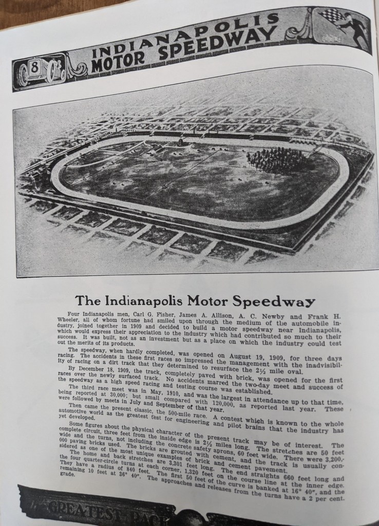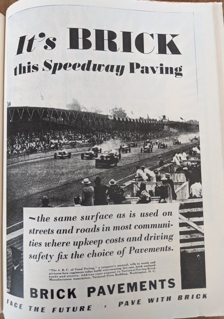 The track had a different look in 1930. The first and second turns look more like one curve than they do today. The photo reminded me a bit of Gateway’s track, although the curve is not as severe.