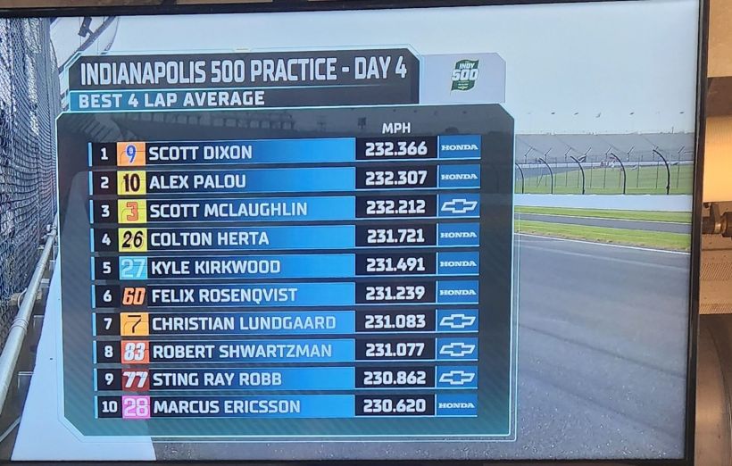 Scott McLaughlin had the fastest single lap of the day this very early, a 233,954 mph scorcher, but Scott Dixon edged teammate Alex Palou for the best four lap average.