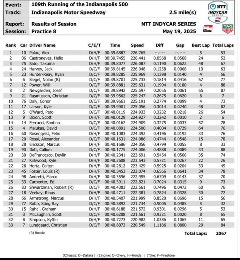 Christian Rasmussen hit the wall coming out of turn and slid to the inside grassy area. It was a gentle hit and slide. The rest of the practice was clean. Alex Palou was fastest. Pole sitter Robert Shwartzman was 26th.