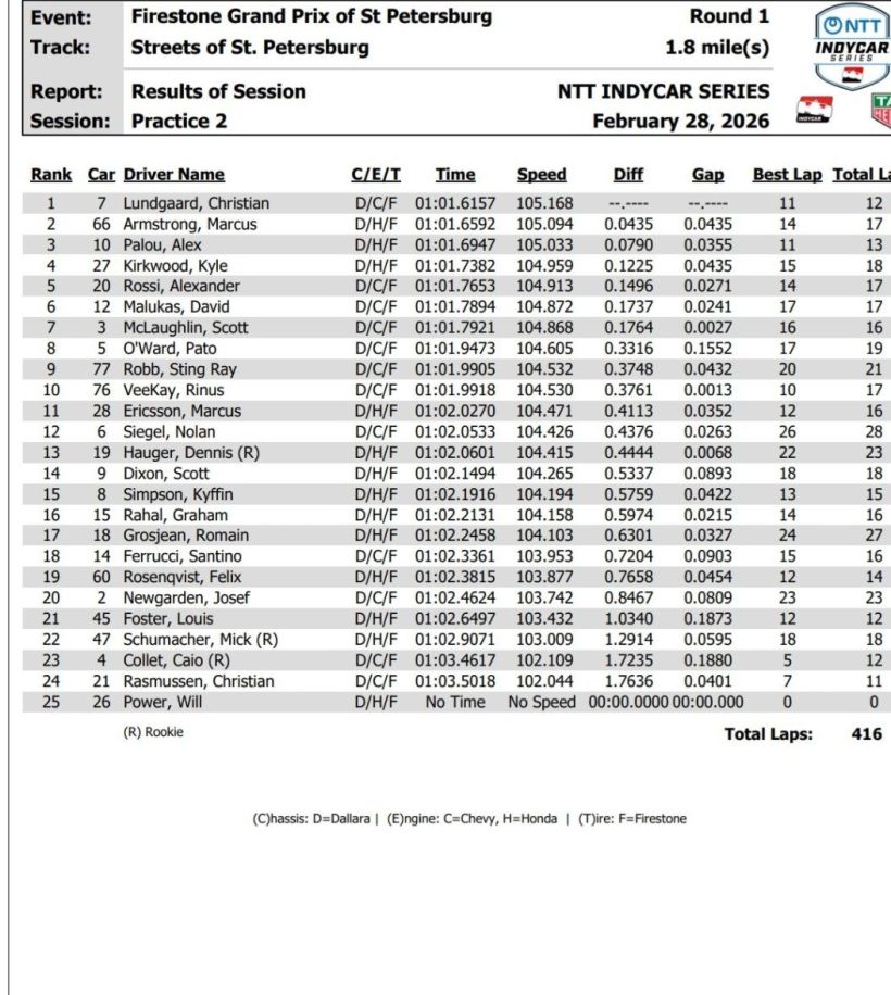 Christian Lundgaard led this morning’s practice. his time 1:01.657 was a half second slower than Scott McLaughlin’s fast time from yesterday.