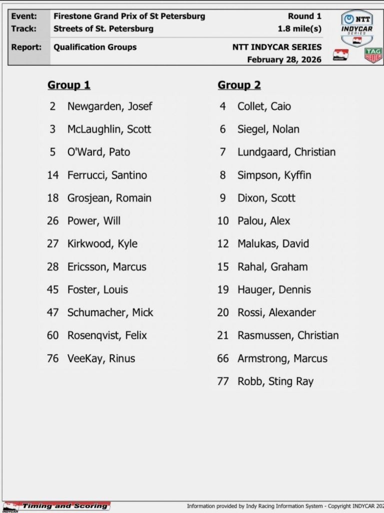 Note: For 2026 qualifying groups are determined by the qualifying results from the previous event. At St. Pete groups are determined based on 2025 final entrant points.
