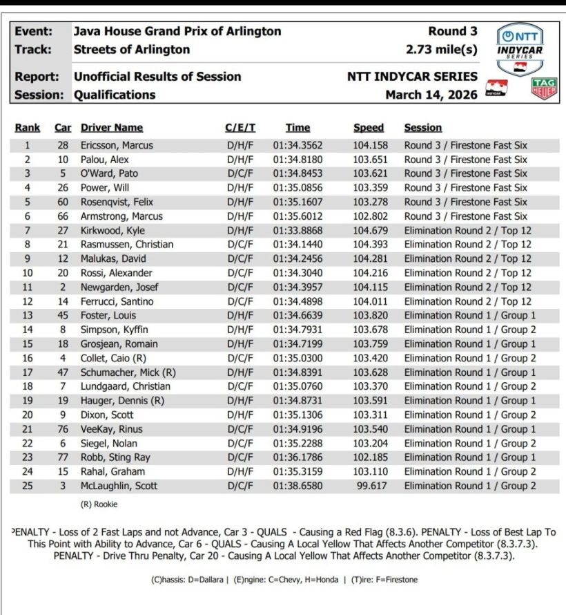 It has been 13 years since Marcus Ericsson won a pole position for a race. Today that streak ended as Ericsson won the pole in a new format for tomorrow’s IndyCar race at Arlington, Texas. Ericsson had the advantage of running his single Fast Six lap on warm tires, and his time stood up to a challenge by Alex Palou, the last driver on track.