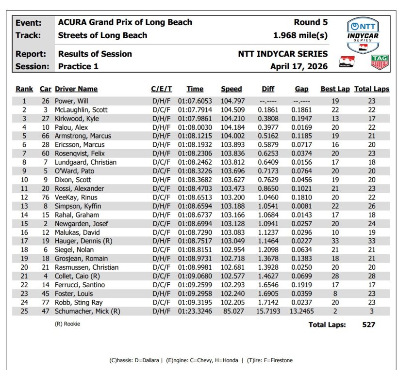 Will Power led Practice 1 for the Acura Grand Prix of Long Beach and his Andretti teammates placed in the top six. Points leader Kyle Kirkwood finished third, and Marcus Ericsson was sixth fastest.
