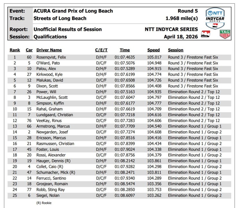 The former teammates will share the front row, while the top two in the standings, Palou and leader Kyle Kirkwood, will roll off in row 2. Full results are at the end of this post.