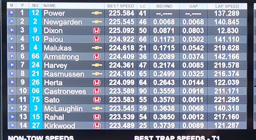 Will Power led most of the afternoon with teammate Josef Newgarden second. Alex Palou jumped to the top of the pylon with the fastest lap of the two days, 227.546 mph, just after practice resumed.