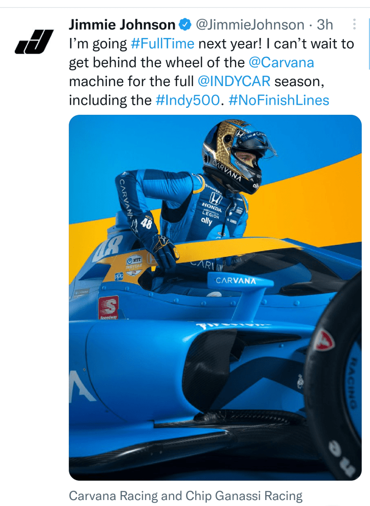 The announcement this morning that Jimmie Johnson would enter the Indianapolis 500 was not a surprise, but the fact that he will run the four other oval race was. The seven time NASCAR champion announced that he will run the entire NTT Indycar Series season in 2022. The Chip Ganassi Racing entry will bear Carvana as his primary sponsor for 16 of the 17 races. The American Legion will be on the number 48 car for one of the two Iowa races. Carvana was Johnson’s amin sponsor in 2021.