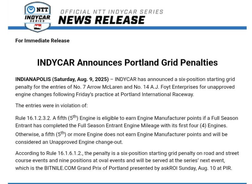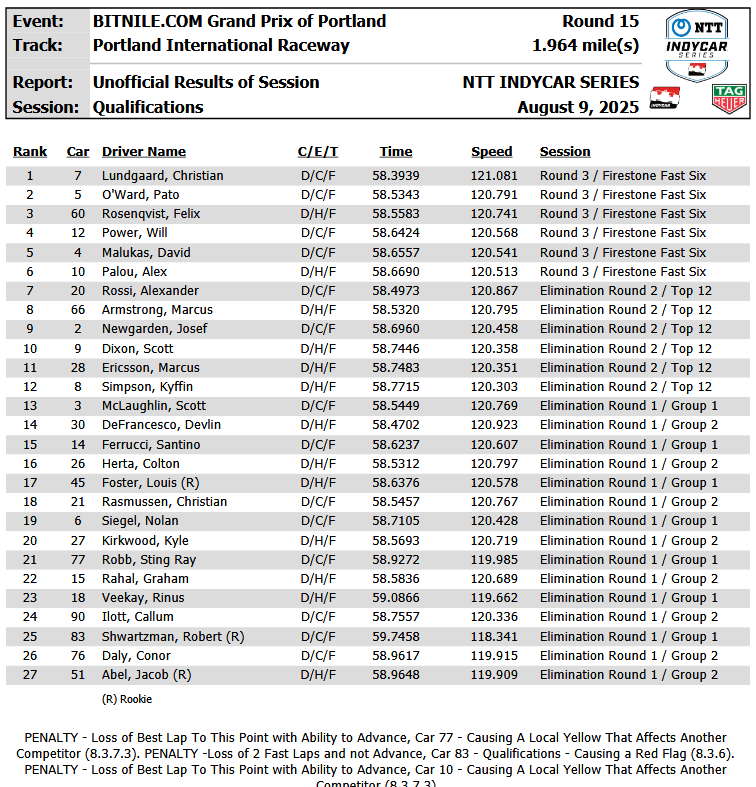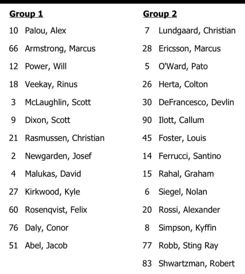After all penalties are served, Lundgaard will start seventh, Newgarden 15th, Kyffin Simpson will start 18th, and Santino Ferrucci will lineup 21st.