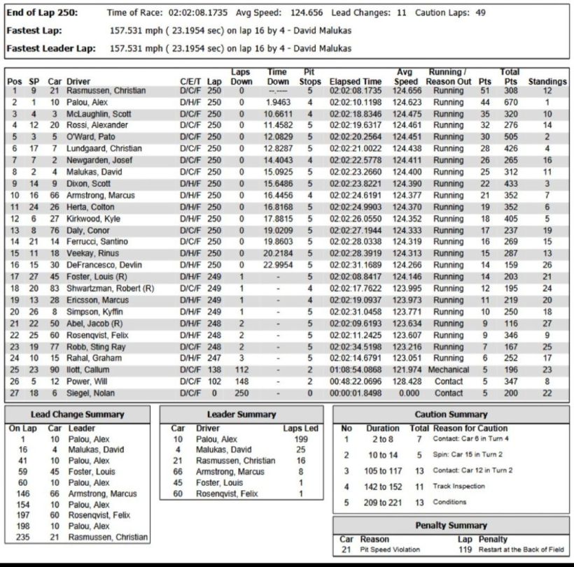 Congratulations to Christian Rasmussen on joining the IndyCar Winners’ Club. I think this is the first of many for him.