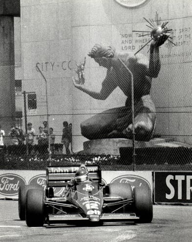 Ayrton Senna on his way to victory in the 1986 Detroit Grand Prix. Image from the Detroit Free Press