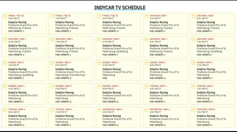 Sunday, March 2 9:02-9:27 a.m. – NTT INDYCAR SERIES warmup, FS2 10:10 a.m. – INDY NXT by Firestone Grand Prix of St. Petersburg (45 laps/81 miles/55 minutes), FS1 (Live) Noon – FOX Sports on air 12:22 p.m. – “Drivers, start your engines” 12:29 p.m. – Firestone Grand Prix of St. Petersburg presented by RP Funding (100 laps/181 miles), FOX, FOX Sports Deportes, FOX Sports App (Live) “WHAT TO LOOK FOR” AT ST. PETERSBURG: Palou begins historic title chase: Chip Ganassi Racing’s Alex Palou arrives at the season opener as the defending NTT INDYCAR SERIES champion for the third time in four seasons.The three-time series champion from Spain will look to make history by becoming the first back-to-back-to-back champion since Dario Franchitti won three titles in a row for Chip Ganassi Racing from 2009-11.Only three previous drivers have won three successive INDYCAR SERIES championships. Ted Horn won three straight from 1946-48, SebastienBourdais won four straight from 2004-07 and Franchitti. Dixon eyeing first St. Pete win: Scott Dixon has six NTT INDYCAR SERIES championships, which trails only the seven INDYCAR SERIES titles collected by A.J. Foyt. His 58 wins rank second on the all-time INDYCAR SERIES victory list, behind Foyt’s 67, but the streets of St. Petersburg might be his kryptonite. It is one of five tracks on the schedule where Dixon is winless and the one where he has the most starts (20). Dixon has been successful on the streets of St. Petersburg. Dixon has four runner-up finishes at the circuit and has an average finish of 7.6 in his 20 previous starts. He has finished in the top 10 in his last nine starts, including seventh in 2024.