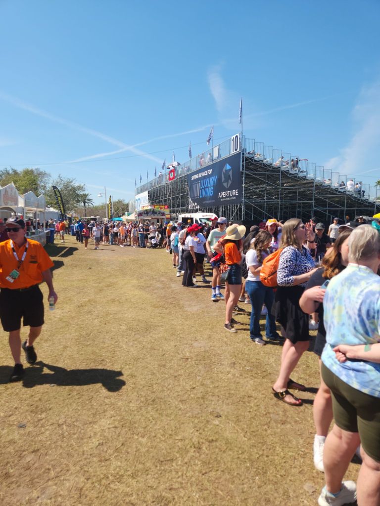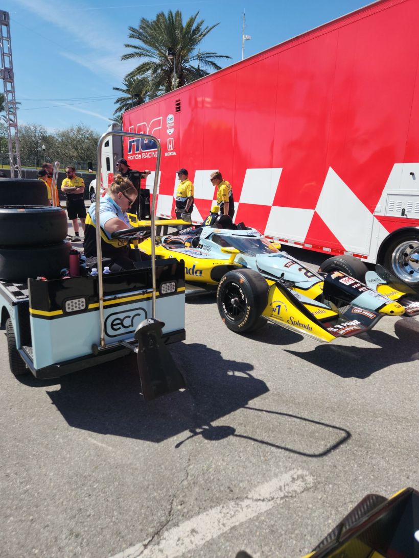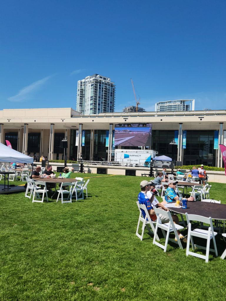 A robust size crowd and sunny skies has the Firestone Grand Prix of St. Petersburg off to a great start. While waiting for the 3:05 pm start to IndyCar practice, I took a walk through the midway. It looks like there are more vendors than last year, and a new fan amenity has been added to the lawn in front of the Mahaffey Theater. Tables and chairs are set up, and a big screen television is attached s above the theater. The set up is similar to the fan plaza at the Rolex in Daytona for the 24 race.