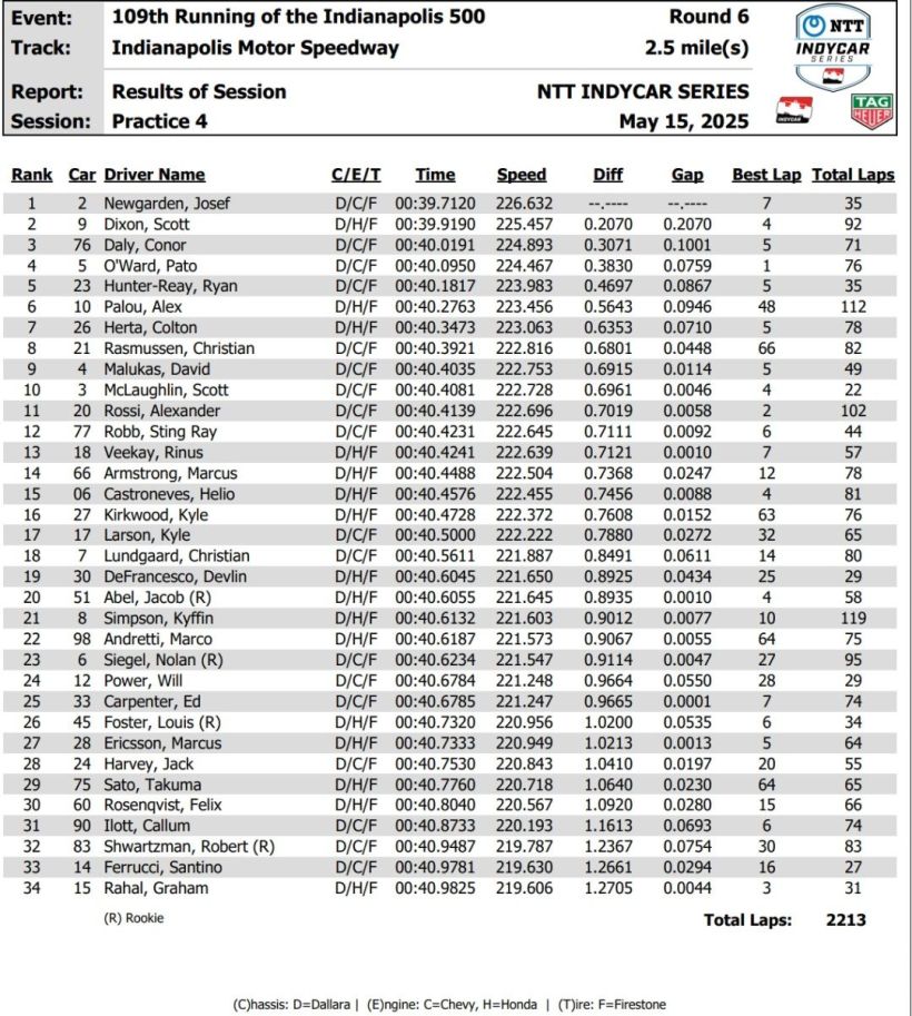 Louis Foster won the Rookie of the Year by two points over Robert Shwartzman. Shwartzman finished 14th and Foster ended the day in 20th. A blocking penalty on lap 220 cost Shwartzman the two spots he needed to win the honor.