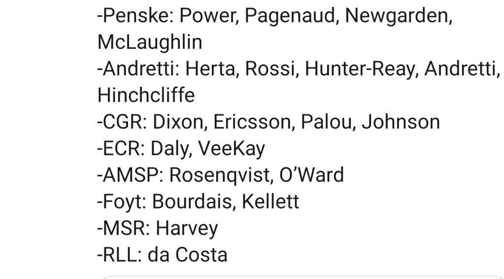 21 cars will participate in the first official day of offseason testing for the NTT Indycar Series today. First time drivers taking part are three time Australian Supercars Champion Scott McLaughlin for Team Penske, seven time NASCAR champion Jimmie Johnson for Chip Ganassi racing, and Formula E champion Antonio Felix da Costa for Rahal Letterman Lanigan Racing. The da Costa test is a courtesy test and not expected to lead to an Indycar ride.