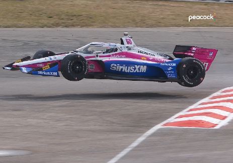 Felix Rosenqvist had a wild ride over the turn 1 curbing, captured by Peacock. He is now just two hours short of getting his pilot’s license.