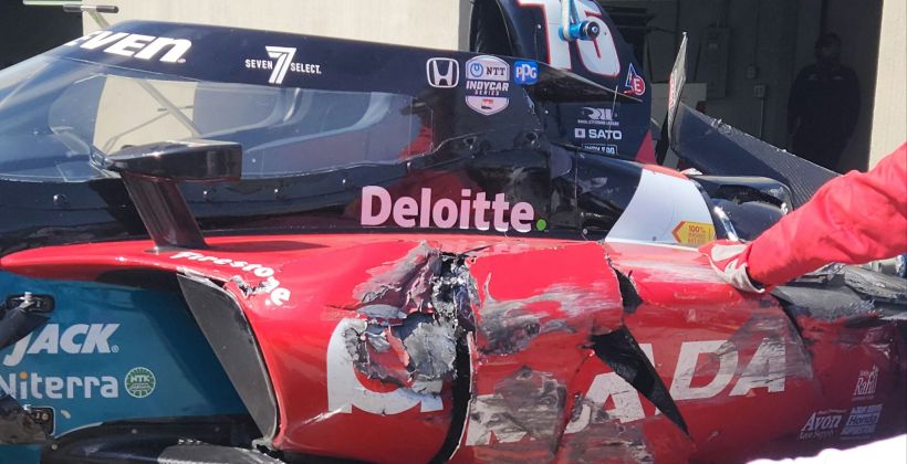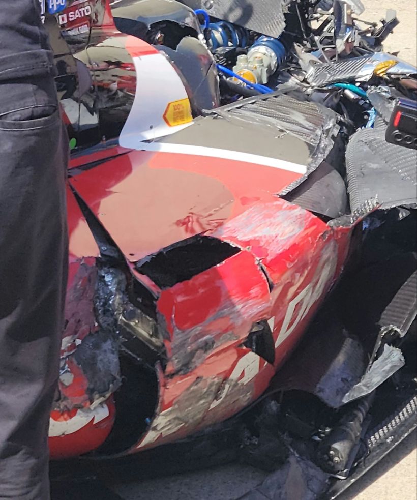 Practice resumed, but only for a moment before Takuma Sato made hard contact in turn 1, slid into turn 2 and hit the wall again. Sato had turned the second fastest lap of the day and was atop the no tow chart at the time of his accident. The car looks like a total loss.