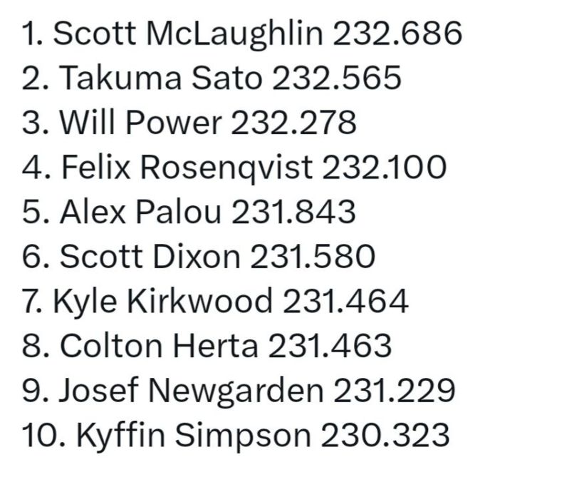 Scott McLaughlin had the fastest single lap at 232.686. 12 drivers topped 230 mph.
