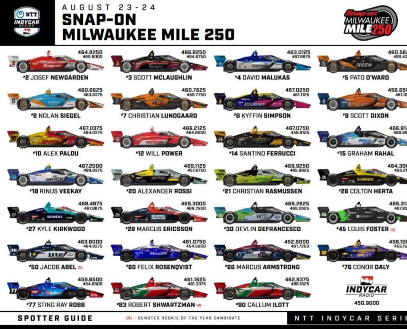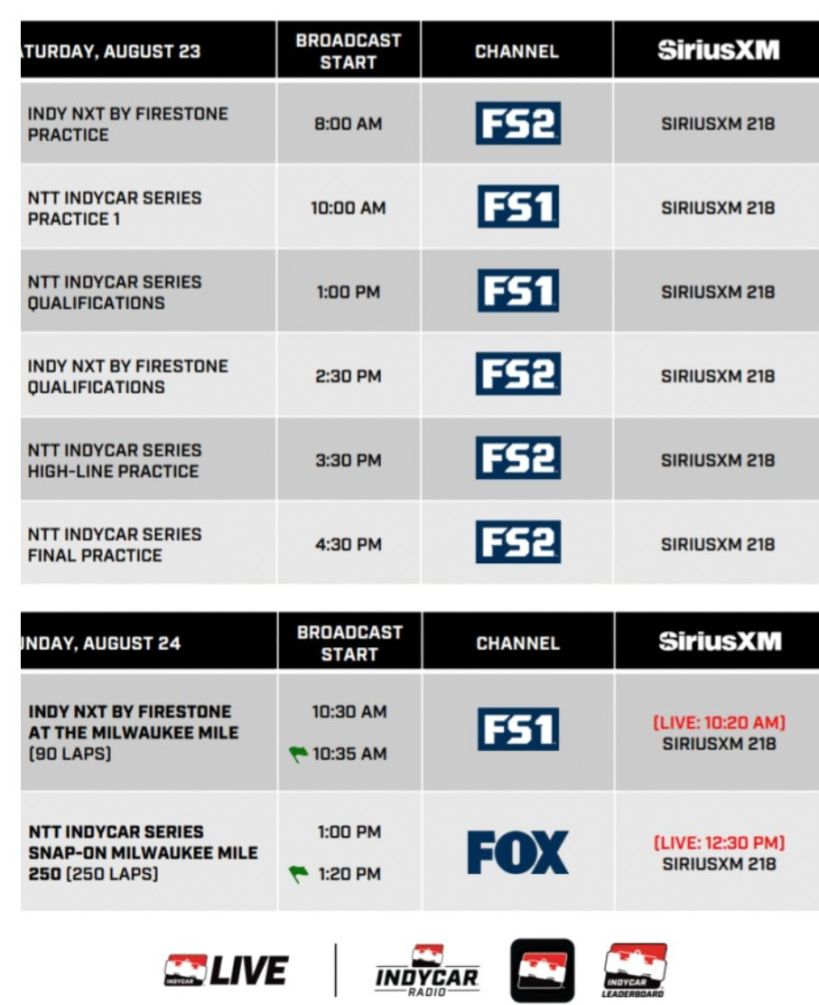 Race weekend: Saturday, Aug. 23-Sunday, Aug. 24 Track: Milwaukee Mile, a 1.015-mile oval in West Allis, Wisconsin Race distance:NTT INDYCAR SERIES: Snap-on Milwaukee Mile 250: 250 laps/253.75 miles INDY NXT by Firestone: INDY NXT by Firestone at the Milwaukee Mile: 90 laps/91.35 miles Hybrid energy deployment parameters :NTT INDYCAR SERIESUnlimited activation with a maximum deployment of 150 kilojoules (kJ) per lap .Firestone tire allotment: NTT INDYCAR SERIES Ten sets for use through the event weekend. An additional set is available so teams can participate in the group session Saturday .INDY NXT by Firestone Three new sets for use through the event weekend. A carryover set from the Milwaukee Open Test in June may be used during pre-qualifying practice sessions Saturday. X: @TheMKEMile, @IndyCar, @INDYNXT #SnapOn250 #INDYCAR Instagram: @themilwaukeemile, @INDYCAR, @INDYNXT, #SnapOn250 #INDYCAR Threads: @INDYCAR, @INDYNXT Facebook: @MilwaukeeMileRacing, @INDYCAR, @INDYNXT, #INDYCAR TikTok: @INDYCAR, #INDYCAR YouTube: @INDYCAR Event website: www.wistatefair.com/wsfp/indycar-weekend-at-the-milwaukee-mile/ INDYCAR website: www.indycar.com 2024 race winners NTT INDYCAR SERIES Race 1: Pato O’Ward (No. 5 Arrow McLaren Chevrolet) Race 2: Scott McLaughlin (No. 3 Gallagher Team Penske Chevrolet )INDY NXT by Firestone Louis Foster (No. 26 Andretti Global) 2024 NTT P1 Award winners: Race 1: Scott McLaughlin (No. 3 Odyssey Battery Team Penske Chevrolet), 22.5082 seconds, 162.341 mph Race 2: Josef Newgarden (No. 2 PPG Team Penske Chevrolet), 22.6980 seconds, 160.983 mph 2024 INDY NXT by Firestone pole winner: Louis Foster (No. 26 Andretti Global), 48.3396 seconds, 151.180 mph (two laps) One-lap qualifying record: NTT INDYCAR SERIESPatrick Carpentier, 20.028 seconds, 185.500 mph, May 30, 1998 INDY NXT by FirestoneMark Hotchkis, 23.692 seconds, 151.952 mph, June 2, 1996 Two-lap qualifying record: NTT INDYCAR SERIESDario Franchitti, 42.7768 seconds, 170.840 mph, June 18, 2011INDY NXT by Firestone Louis Foster, 48.3396 seconds, 151.180 mph, Aug. 31, 2024 FOX Sports telecasts: NTT INDYCAR SERIES: Practice 1, 11 a.m. ET Saturday, FS1 (live); Qualifying, 2 p.m. ET Saturday, FS1 (live); Final Practice, 4:30 p.m. ET Saturday, FS2; Snap-on Milwaukee Mile 250, 2 p.m. ET, Sunday, FOX (live). Will Buxton is the play-by-play announcer for FOX’s coverage of the NTT INDYCAR SERIES, alongside analysts Townsend Bell and James Hinchcliffe. Georgia Henneberry, Kevin Lee and Jack Harvey are the pit reporters. INDY NXT by Firestone: Practice 1, 9 a.m. ET Saturday, FS2 (live); Qualifying, 3:30 p.m. ET Saturday, FS2 (live); Race, 11:30 a.m. ET Sunday, FS1 (live). Kevin Lee is the play-by-play announcer for FOX Sports’ coverage of INDY NXT by Firestone alongside analyst Jack Harvey. Georgia Henneberry is the pit reporter. INDYCAR Radio Network broadcasts: Mark Jaynes is the anchor alongside driver analyst Davey Hamilton. Nick Yeoman is the turn announcer. Jake Query, Michael Young and DJ Clark are the pit reporters. The Snap-on Milwaukee Mile 250 race (1:30 p.m. ET Sunday) can be heard live on network affiliates nationwide. The NTT INDYCAR SERIES race, INDY NXT by Firestone race (11:25 a.m. ET Sunday), NTT P1 Award Qualifying (2 p.m. ET Saturday) and all NTT INDYCAR SERIES practices also air live on SiriusXM 218, www.indycar.com/leaderboard and the INDYCAR App powered by NTT DATA. At-track schedule (all times Central): SATURDAY, AUG. 23 8:05-8:55 a.m. INDY NXT by Firestone Practice, FS2 9:45 a.m. NTT INDYCAR SERIES Installation Laps 10-11 a.m. NTT INDYCAR SERIES Practice, FS1 1:05 p.m. NTT INDYCAR SERIES Qualifying (Single car, two laps), FS1 2:35-3:20 p.m. INDY NXT by Firestone Qualifying (Single car, two laps), FS2 3:45-4:15 p.m. NTT INDYCAR SERIES Group Session (Two groups, 15 minutes each), FS2 4:30-5:30 p.m. NTT INDYCAR SERIES Final Practice, FS2 SUNDAY, AUG. 24 10:31 a.m. INDY NXT by Firestone at the Milwaukee Mile “Drivers, start your engines” 10:35 a.m. INDY NXT by Firestone at the Milwaukee Mile (90 laps/91.35 miles), FS1 (Live) 1 p.m. FOX on air 1:15 p.m. “Drivers, start your engines” 1:20 p.m. Snap-on Milwaukee Mile 250 (250 laps/253.75 miles), FOX (Live) NTT INDYCAR SERIES Notes: Alex Palou became the first INDYCAR SERIES champion since Cristiano da Matta in 2002 to clinch the series title with two races remaining when he clinched his third consecutive NTT INDYCAR SERIES crown Aug. 10 at Portland International Raceway. Palou could cap his historic 2025 season with another record should he win the final two races of the season – tying A.J. Foyt and Al Unser’s record of 10 wins in a season.The Snap-on Milwaukee Mile 250 will be the 16th race of the 2025 season. There have been five winners in 15 NTT INDYCAR SERIES races in the 2025 season. Alex Palou (Streets of St. Petersburg, The Thermal Club, Barber Motorsports Park, Indianapolis Motor Speedway road course, Indianapolis 500, Road America, Iowa Speedway-2, WeatherTech Raceway Laguna Seca), Kyle Kirkwood (Streets of Long Beach, Streets of Detroit, World Wide Technology Raceway), Scott Dixon (Mid-Ohio Sports Car Course), Pato O’Ward (Iowa Speedway-1, Streets of Toronto) and Will Power (Portland International Raceway) have all won in 2025. The Snap-on Milwaukee Mile 250 will be the fifth oval race of the 2025 NTT INDYCAR SERIES schedule. The first four oval races were won by drivers from three different teams. Chip Ganassi Racing’s Alex Palou (Indianapolis 500 and Iowa Speedway-2), Andretti Global’s Kyle Kirkwood (World Wide Technology Raceway) and Arrow McLaren’s Pato O’Ward (Iowa Speedway-1). The remaining oval race is scheduled for Aug. 31 at Nashville Superspeedway.The Snap-on Milwaukee Mile 250 will be the 116th INDYCAR SERIES event at the Milwaukee Mile. Scott Dixon, Scott McLaughlin, Pato O’Ward and Will Power are the only drivers to win at Milwaukee entered in the event. ACTIVE RACE WINNER WINS SEASONS Scott Dixon 1 2009 Will Po