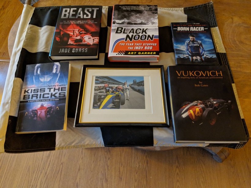Of the books pictured, Black Noon is my favorite. Tammy Kaehler’s Kiss the Bricks is an entertaining mystery centered around the 500. Her hero, Kate Reilly, has other adventures in sportscar series, chronicled in other books by Kaehler, such as Dead Man’s Switch.