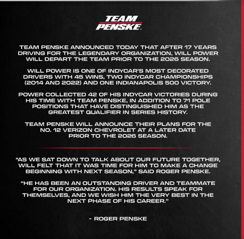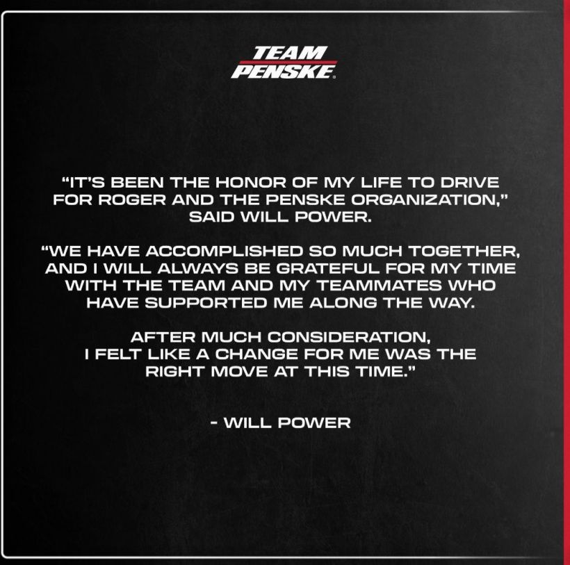 The VeeKay news served as Tuesday’s appetizer. Shortly thereafter, Will Power announced he was leaving Team Penske after 17 years. There will likely never be another driver spending 17 years with the same team, let alone the same sponsor. The outpouring of love and respect from fans and the paddock for Power was great to see. It took me several years to warm up to him, but I came to respect him as a person and admire him as a driver.